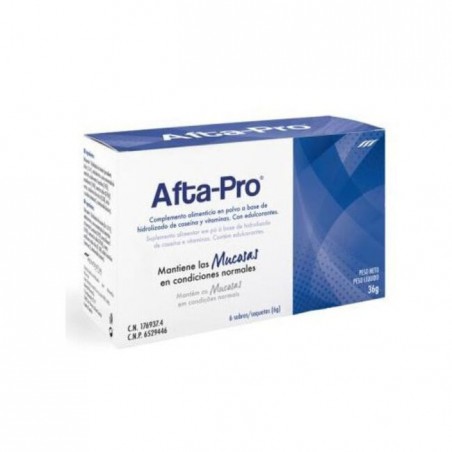 AFTA-PRO 6 SOBRES 6 G es un complemento nutricional formulado para mantener las mucosas en condiciones normales. Ideal para adultos y niños a partir de 6 años, su composición a base de hidrolizado de caseína y vitaminas permite una absorción rápida y eficaz. Es especialmente adecuado para quienes buscan mejorar la salud de sus mucosas de forma sencilla y natural.