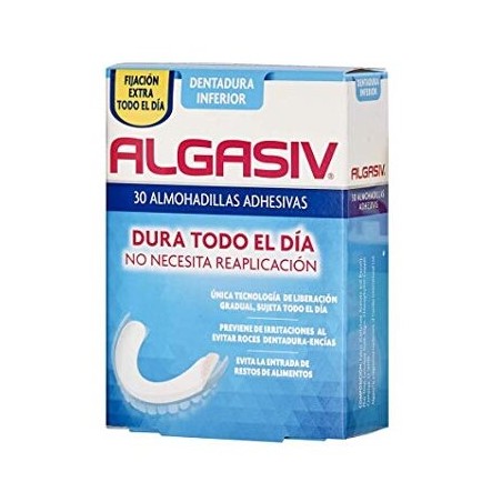 Algasiv Almohadilla Inferior 30 uds es una solución diseñada específicamente para mejorar la sujeción y la comodidad de las dentaduras postizas completas inferiores. Estas almohadillas de uso diario están indicadas para personas que desean evitar molestias, irritaciones y la entrada de restos de alimentos bajo la prótesis dental, asegurando un ajuste firme y seguro durante todo el día.