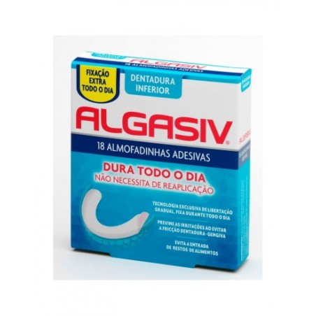ALGASIV ALMOHADILLAS INFERIOR 18 UDS son almohadillas adhesivas especialmente formuladas para fijar y adaptar la prótesis dental inferior. Este producto está orientado a personas que utilizan dentaduras postizas completas y buscan una solución eficaz para evitar movimientos, aportar mayor confort y proteger las encías durante todo el día.