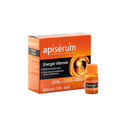 APISERUM ENERGIA VITAMAX 18 VIALES es un complemento alimenticio ideal para quienes buscan más energía y vitalidad en su día a día. Formulado con jalea real, ginseng, 12 vitaminas y minerales, está diseñado para adultos y adolescentes a partir de 14 años que necesiten potenciar su rendimiento físico e intelectual, especialmente durante periodos de estrés, fatiga o gran exigencia.