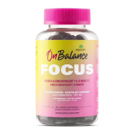 AQUILEA ONBALANCE FOCUS 60 GOMINOLAS SABOR CEREZA es un complemento alimenticio en formato de gominolas diseñado específicamente para favorecer la concentración, la memoria y el equilibrio mental en adultos. Gracias a su innovadora fórmula con ashwagandha, eleuterococo, vitamina B5 y aceite de semilla de cáñamo, este producto resulta ideal para personas que necesitan un impulso cognitivo o apoyo durante periodos de exigencia intelectual o estrés moderado.