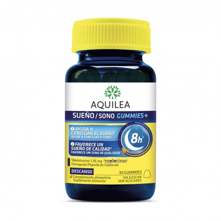 AQUILEA SUEÑO GUMMIES+ 30 GUMMIES es un complemento alimenticio en formato gominola especialmente formulado para favorecer la conciliación y el mantenimiento del sueño. Su fórmula avanzada, basada en melatonina de liberación prolongada y extractos botánicos, está orientada a adultos con dificultades para dormir o mantener el sueño durante la noche.