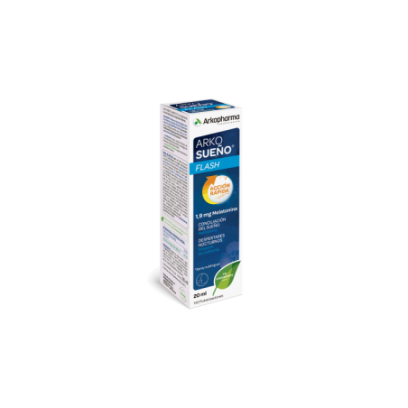 ARKO SUEÑO FLASH 1 SPRAY SUBLINGUAL 20 ML es un complemento alimenticio en formato spray listo para usar que ayuda a conciliar el sueño más rápido y a reducir los despertares nocturnos gracias a su fórmula con melatonina y extracto de Amapola de California. Especialmente indicado para adultos que buscan una solución rápida y eficaz frente a problemas de sueño ocasionales, desfase horario (jet lag) o dificultades transitorias para mantener el descanso nocturno.