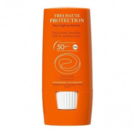 AVENE SOLAR SPF50 STICK ZONAS SENSIBLES 10 gr es un protector solar en formato stick especialmente formulado para aportar una alta protección solar SPF50+ en las zonas sensibles localizadas del rostro y el cuerpo. Este producto está dirigido a adultos y niños a partir de tres años, incluyendo deportistas y personas activas, y es ideal para pieles sensibles que buscan protección eficaz frente a rayos UVA y UVB.
