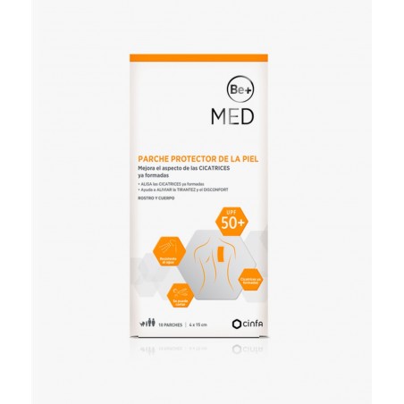 BE+ MED Parche Protector de la Piel 10 Parches 15 cm x 4 cm es un dispositivo sanitario diseñado para mejorar el aspecto de cicatrices ya formadas en la piel, aportar elasticidad y proteger frente a la radiación solar. Está indicado para adultos y niños que necesitan acelerar la recuperación cutánea, reducir la tirantez y prevenir la aparición de cicatrices enrojecidas o queloideas.