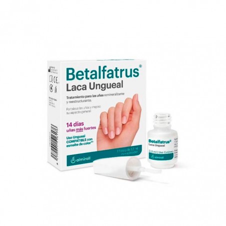 BETALFATRUS 3,3 ML es una laca ungueal hidrosoluble especialmente formulada para fortalecer y mejorar la apariencia de las uñas debilitadas o con alteraciones estructurales como grietas, surcos o engrosamientos. Recomendado para personas que sufren de fragilidad ungueal, onicorrexis o psoriasis en las uñas, este producto actúa como tratamiento reestructurante y remineralizante para las uñas dañadas, ayudando a recuperar su salud y belleza.