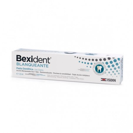 Bexident Pasta Blanqueante 125 ml está indicada para adultos y adolescentes mayores de 12 años y no presenta contraindicaciones conocidas; sin embargo, se recomienda consultar a un profesional sanitario en caso de alergias, sensibilidad extrema o patologías bucales particulares. Evitar el contacto con los ojos y mantener fuera del alcance de los niños pequeños.