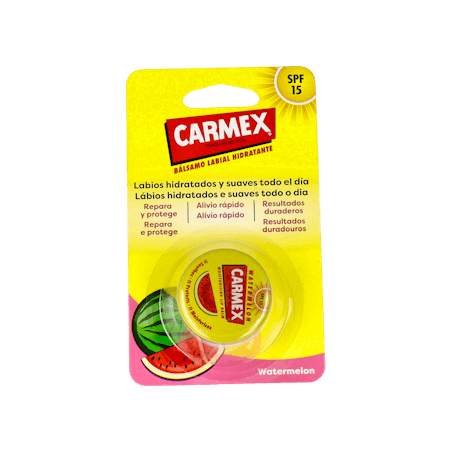 Carmex Protector Labial Tarro Sandía SPF15+ 7,5 G es un bálsamo labial diseñado para hidratar y proteger los labios secos o agrietados, ofreciendo una acción intensiva y un delicioso aroma a sandía. Este producto es ideal para quienes buscan prevención y alivio frente a las agresiones externas como el sol, el viento o el agua, manteniendo los labios suaves, protegidos y con sensación de frescor. Para adultos y adolescentes que desean un cuidado labial diario, Carmex es la elección perfecta por su combinación de protección solar e hidratación.