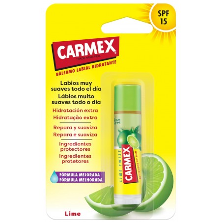 CARMEX PROTECTOR LABIAL TUBO LIMA 4.25 G es un bálsamo labial especialmente formulado para hidratar, proteger y reparar los labios secos o agrietados. Gracias a su refrescante sabor a lima y a su contenido en SPF 15, ofrece protección diaria frente a la radiación solar, siendo ideal para adultos y adolescentes que buscan mantener unos labios suaves y saludables en cualquier época del año.
