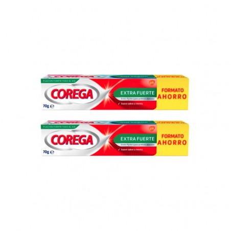 COREGA EXTRA FUERTE 70 GR DUPLO es una crema adhesiva para prótesis dentales, diseñada para ofrecer una fijación extra fuerte y duradera. Su fórmula está pensada para quienes buscan seguridad, comodidad y protección frente a movimientos indeseados de la prótesis dental. Ideal para adultos que utilizan dentaduras completas o parciales y desean un frescor diario con sabor a menta.