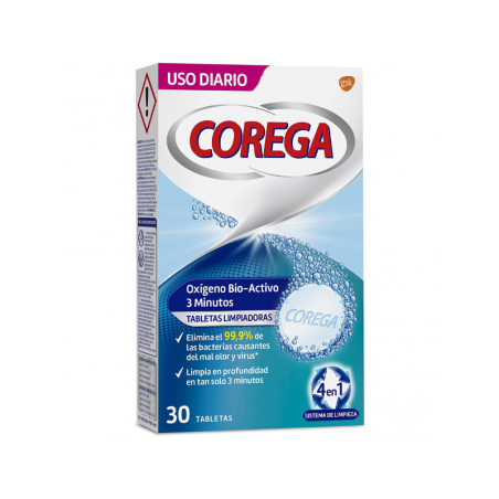 Recupere la frescura y el brillo de su prótesis con Corega Oxígeno Bio-Activo 30 Tabletas y disfrute de una higiene bucal avanzada cada día. ¡Adquiera ahora su limpieza profesional en casa!