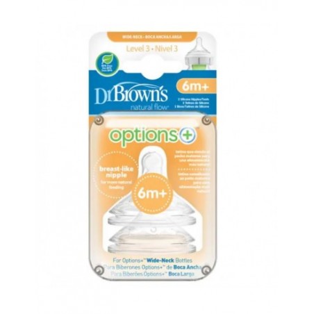 DR BROWN'S B ANCHA TETINA NIVEL 3 +6 2U es un pack de dos tetinas de silicona extra suave para biberones de boca ancha, diseñado especialmente para bebés a partir de 6 meses de edad. Estas tetinas están indicadas para facilitar la transición hacia una alimentación más rápida y eficiente cuando el bebé desarrolla una capacidad estable de succión y comienza a incorporar alimentos sólidos a su dieta. Idóneas para padres que buscan comodidad y seguridad durante la alimentación de sus pequeños.