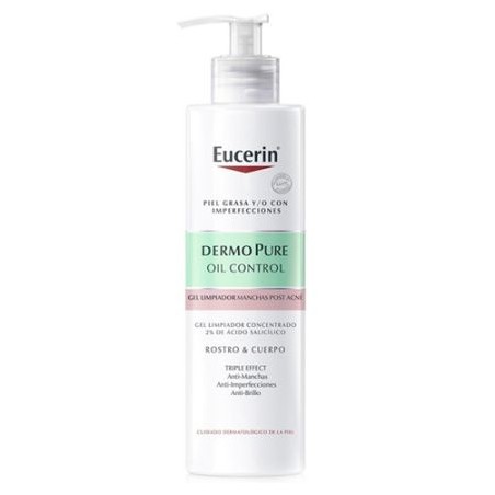 EUCERIN DERMOPURE GEL LIMPIADOR CONCENTRADO TRIPLE EFECTO 1 ENVASE 400 ML es un gel limpiador dermatológico formulado especialmente para pieles grasas y con imperfecciones. Este gel ayuda a combatir eficazmente el exceso de sebo, las marcas post-acné y el brillo facial, gracias a su combinación única de ácido salicílico y complejo exfoliante de ácidos AHA/BHA/PHA. Está indicado para adolescentes y adultos que desean reducir imperfecciones y mejorar la textura de su piel.