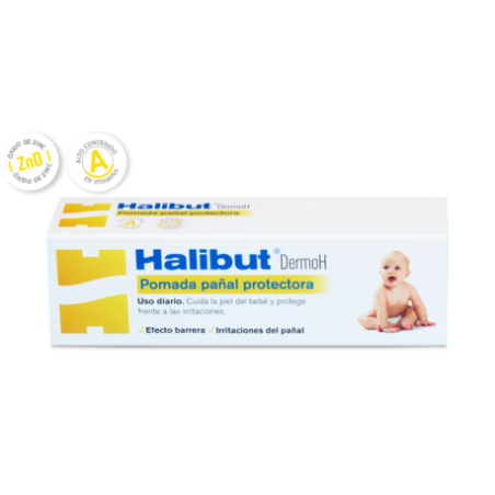 HALIBUT Pomada Protectora Infantil 45 gr es una pomada de uso pediátrico específica para proteger, calmar y regenerar la piel delicada de bebés y niños, especialmente en zonas sensibles como el área del pañal. Gracias a su fórmula enriquecida con vitamina A y óxido de zinc, ayuda a prevenir y tratar irritaciones, escoceduras y rojeces, manteniendo la piel suave y confortable. Está indicada para padres y cuidadores que desean un producto de confianza para el cuidado diario de la piel infantil.