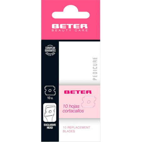 HOJAS BETER REPUESTO CORTACALLOS 24028 10 UDS es el recambio ideal para quienes buscan resultados profesionales al eliminar callosidades y durezas en pies o manos. Estas hojas, fabricadas en acero al carbono con doble filo, están orientadas a usuarios que utilizan cortacallos manuales, garantizando la máxima precisión en cada pasada y una mayor duración de uso.