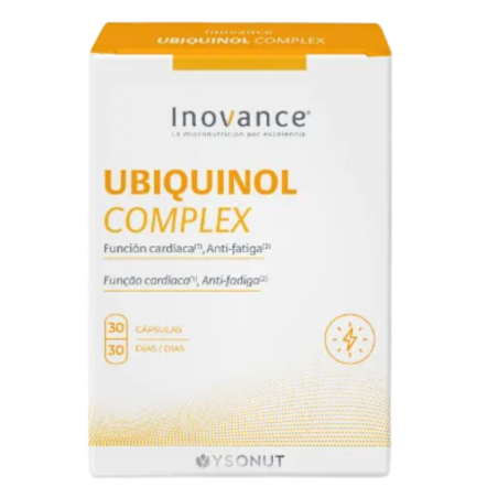 INOVANCE UBIQUINOL COMPLEX 30 cápsulas es un complemento alimenticio formulado para favorecer la salud cardiovascular y combatir la fatiga, gracias a su contenido en ubiquinol (coenzima Q10 activa) junto a vitaminas C, E, B3 y B1. Este suplemento está dirigido especialmente a adultos a partir de 40 años, deportistas, personas en tratamiento con estatinas y quienes buscan proteger sus células del estrés oxidativo o mejorar su vitalidad diaria.
