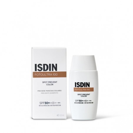 ISDIN FotoUltra 100 Spot Prevent Color SPF 50+ 50 ml es un fotoprotector facial de muy alta protección especialmente formulado para prevenir manchas solares y alteraciones pigmentarias provocadas por la radiación UVB/UVA, luz azul y polución. Su textura ligera con color está indicada para todo tipo de pieles, incluidas las sensibles, y es ideal para quien busca proteger la piel, unificar el tono y prevenir el envejecimiento prematuro o la hiperpigmentación.