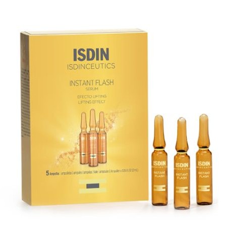 ISDINCEUTICS INSTANT FLASH 5 Ampollas 2 ml es un tratamiento facial en formato ampolla diseñado para lograr un efecto lifting inmediato, disimular arrugas y devolver la luminosidad a la piel. Estas ampollas están indicadas para aquellas personas que quieren un aspecto radiante y rejuvenecido rápidamente, siendo aptas para todo tipo de pieles.