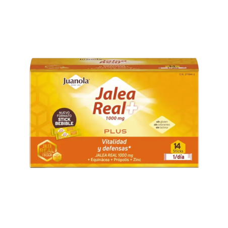 Juanola Jalea Real Plus 14 Sobres 10 ml es un complemento alimenticio especialmente formulado para quienes buscan fortalecer su sistema inmunitario y aumentar su vitalidad de manera natural. Su exclusiva combinación de jalea real fresca, equinácea, própolis, zinc y fructooligosacáridos está indicada para adultos y adolescentes que desean mejorar sus defensas, combatir la fatiga y enfrentar períodos de mayor estrés o exigencia física. Perfecto para cuidar la salud general y el bienestar diario.