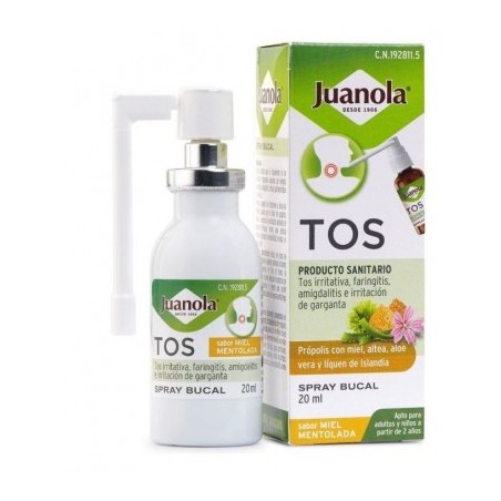 JUANOLA TOS SPRAY BUCAL MIEL MENTOL 120 ML es un producto sanitario de uso tópico indicado para el alivio rápido de la irritación de garganta y la tos asociada. Formulado con ingredientes naturales como miel, mentol, aloe vera y extractos vegetales, está dirigido a adultos y niños a partir de 2 años que buscan proteger y calmar la garganta irritada por faringitis, amigdalitis, reflujo u otros factores externos. Su formato en spray facilita una aplicación cómoda y dirigida.