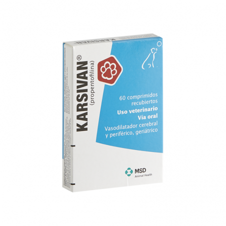 Karsivan 60 comprimidos es un medicamento veterinario desarrollado por Merck Sharp & Dohme Animal Health, especialmente formulado para mejorar la calidad de vida de perros de edad avanzada. Este producto actúa como vasodilatador y regulador circulatorio, ayudando a optimizar la circulación sanguínea y la oxigenación de los tejidos en perros con problemas asociados al envejecimiento. Karsivan 60 comprimidos está indicado para perros que presentan signos de insuficiencia circulatoria, letargia o pérdida de vitalidad.