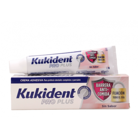 ¡Recupera la seguridad y el confort en tu día a día adquiriendo ya KUKIDENT PRO PLUS BARRERA ANTI-COMIDA SIN SABOR 40 GR y disfruta de una fijación superior en tu dentadura postiza!