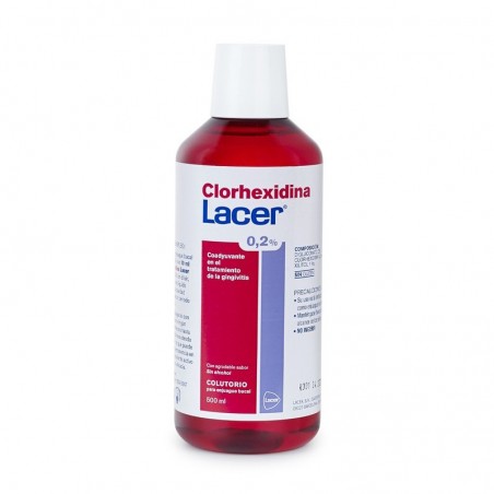 LACER COLUTORIO CLORHEXIDINA 0.2% 500 ML no debe utilizarse en caso de alergia o hipersensibilidad a la clorhexidina u otros ingredientes. El uso prolongado puede causar tinciones dentales reversibles, especialmente si se consume té, café o vino, así como alteraciones temporales del gusto. No está recomendado un uso continuado sin supervisión profesional. Mantener fuera del alcance de los niños y consultar con el odontólogo en caso de duda.