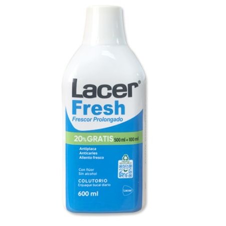 Lacer Colutorio Lacerfresh 500+100 ml es un enjuague bucal sin alcohol diseñado para el uso diario, proporcionando una limpieza profunda y un frescor duradero en la boca. Gracias a su fórmula innovadora, previene la caries dental y combate el mal aliento, estando especialmente recomendado para adultos y adolescentes que buscan una óptima higiene bucal y una sensación refrescante prolongada.