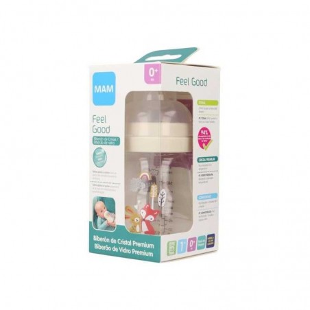 Biberón de cristal MAM Feel Good ofrece máxima resistencia y seguridad para alimentar a tu bebé desde el nacimiento. Además, su tetina de silicona suave imita el pecho materno para una aceptación natural.
