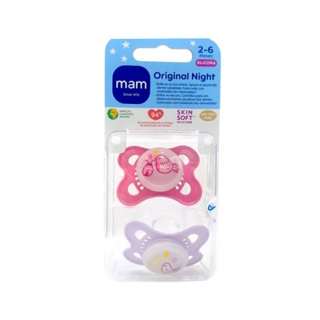 MAM ORIGINAL NIGHT CHUPETE SILICONA FISIOLOGICO + 6 MESES 2 UNIDADES COLOR ROSA