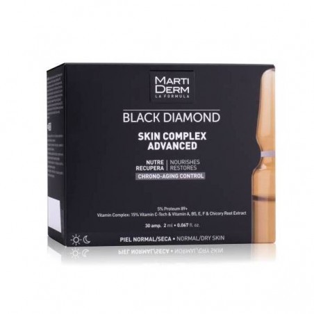Martiderm Black Diamond Skin Complex+ 2 ml 30 ampollas es un avanzado tratamiento antiedad especialmente formulado para combatir el envejecimiento crónico y revitalizar la piel fatigada. Indicado para todo tipo de piel, este complejo de ampollas está diseñado para quienes buscan mejorar la luminosidad, firmeza y elasticidad del rostro, cuello y escote. Su potente fórmula con proteoglicanos inteligentes y un exclusivo complejo vitamínico, proporciona resultados visibles desde la primera aplicación.