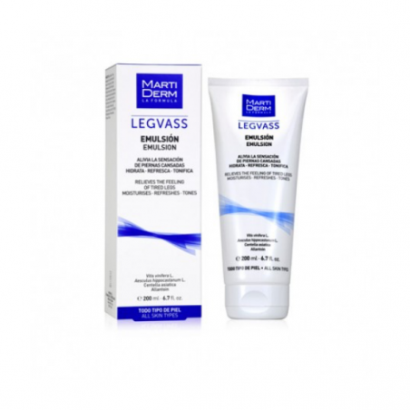 MartiDerm Legvass Hidrodescans 200 ml es una emulsión corporal refrescante especialmente formulada para aliviar la pesadez, el cansancio y la hinchazón en las piernas. Este tratamiento está dirigido a personas que sufren molestias circulatorias, piernas cansadas o necesidad de confort y descanso tras largas jornadas de pie o mucho tiempo sentados. Su uso está recomendado para todo tipo de pieles, incluso las más sensibles.
