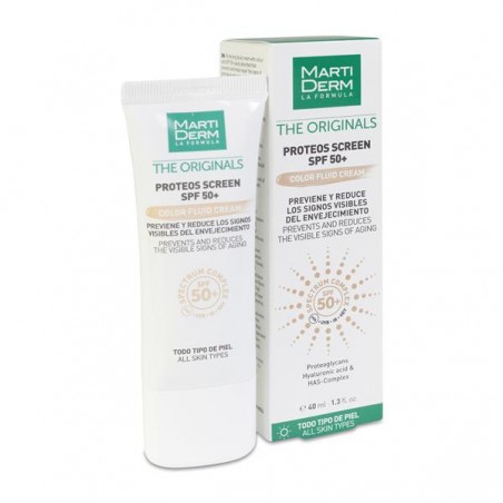 MartiDerm Proteos Screen SPF 50+ Fluid Cream Color 40 ml es una crema facial fluida que combina protección solar avanzada y un tono natural gracias a sus microesferas de color. Especialmente formulada para personas que buscan proteger su piel del sol, prevenir el fotoenvejecimiento y unificar el tono en todo tipo de pieles normales. Perfecta para el uso diario, proporciona un acabado sedoso e invisible mientras cuida y mejora visiblemente la apariencia de la piel.