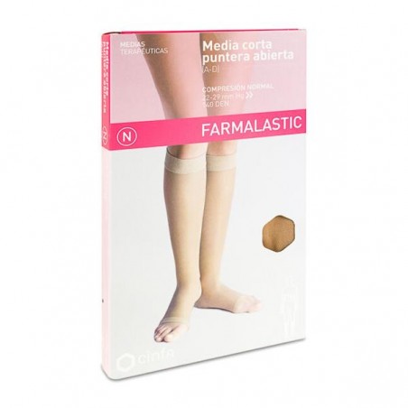 No utilizar la Media Corta (A-D) Compresión Normal Farmalastic Punta Abierta en casos de infecciones cutáneas activas, dermatitis, alergia a poliamida o elastómero, o cuando la compresión esté contraindicada por alteraciones severas de la circulación arterial en las piernas. Si experimenta molestias inusuales, retire la media y consulte a un médico especialista.
