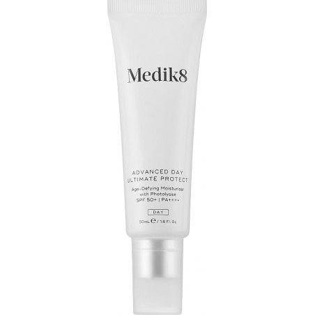 Medik8 Advanced Day Ultimate Protect SPF50+ 50 ml es una crema hidratante antiedad de alta gama diseñada para ofrecer protección solar de amplio espectro y un avanzado cuidado contra el fotoenvejecimiento. Este producto está formulado especialmente para quienes buscan defender su piel frente a la radiación UV, la contaminación urbana y los efectos de la luz azul, a la vez que desean una hidratación profunda y una reducción visible de las arrugas y líneas finas.