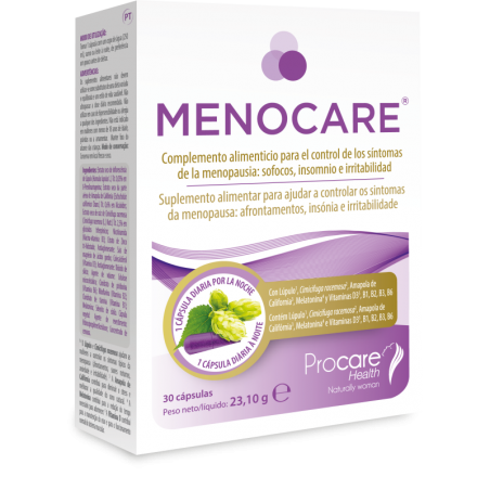 Menocare 30 Cápsulas es un complemento alimenticio diseñado específicamente para aliviar los síntomas asociados a la menopausia. Este producto está destinado a mujeres que experimentan molestias como sofocos, insomnio, irritabilidad y cambios en el estado de ánimo. Menocare combina ingredientes naturales y una fórmula sin hormonas ni isoflavonas, proporcionando una solución eficaz y segura para el bienestar femenino durante esta etapa.