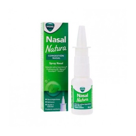 NASAL NATURA 1 frasco 20 ml es un spray nasal de Vicks formulado con solución salina hipertónica al 3%, indicado para el alivio rápido y eficaz de la congestión nasal por alergias, resfriados o sinusitis. Este producto está diseñado para adultos y adolescentes a partir de 12 años que buscan descongestionar sus fosas nasales de manera natural y segura, manteniendo la hidratación y protección de la mucosa.