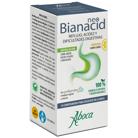 NeoBianacid 14 Comprimidos Sabor Limón es un innovador producto natural especialmente formulado para aliviar los síntomas de acidez, reflujo gastroesofágico, gastritis y dispepsia. Está indicado para adultos y niños a partir de 6 años que buscan una solución eficaz y rápida contra molestias digestivas como el ardor, el dolor y la pesadez de estómago, gracias a su acción protectora y calmante sobre la mucosa gástrica y esofágica.