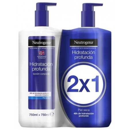 Neutrogena Hidratación Profunda sin Perfume piel seca y sensible 2x1 750 ml es una loción corporal especialmente formulada para proporcionar una hidratación intensiva y prolongada. Este producto está dirigido a personas con piel seca y sensible que buscan un cuidado diario eficaz y seguro, ayudando a restaurar y fortalecer la barrera cutánea gracias a sus ingredientes de alta calidad. Su doble formato permite un uso prolongado, ideal para toda la familia.