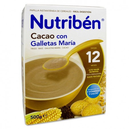 Papilla de cereales con galleta María y cacao para niños desde 12 meses, aporta energía y nutrientes esenciales. Además, está enriquecida con calcio y vitaminas para apoyar el crecimiento.