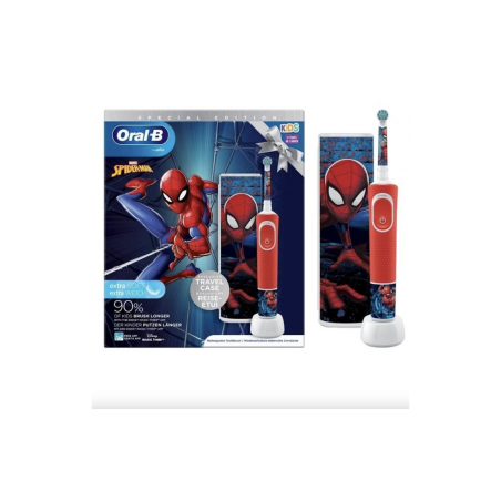 ORAL-B Cepillo Eléctrico Recargable Inf Kids Spiderman Estuche de Viaje es el cepillo perfecto para la higiene bucal de los niños a partir de 3 años. Este cepillo de dientes eléctrico, diseñado específicamente para los más pequeños, ofrece una limpieza eficaz y suave gracias a su cabezal redondo de filamentos extrasuaves. Además, su diseño temático de Spiderman y los accesorios incluidos, convierten el cepillado en un momento divertido y motivador para los niños.