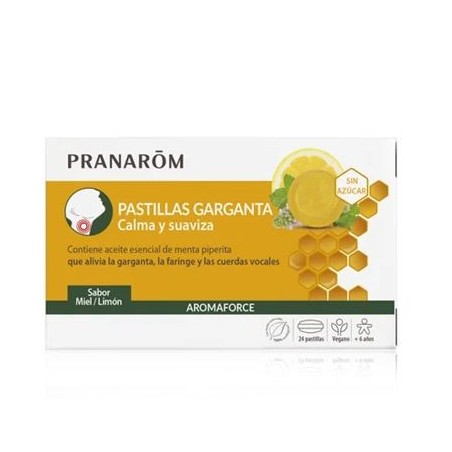 PRANAROM Aromaforce Pastillas Garganta Miel y Limón 24 Pastillas son la solución ideal para calmar y suavizar la irritación o el dolor de garganta. Este producto está especialmente formulado para adultos y adolescentes que buscan alivio rápido y efectivo ante molestias faríngeas, afonía o tos irritativa, gracias a la acción combinada de los aceites esenciales, la miel y el limón.