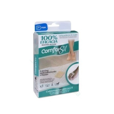 PRIM COMFORSIL AQUA LÁMINA RECORTABLE ADHERENTE 9,5 CM X 9,5 CM es un protector podológico de silicona médica que alivia de forma eficaz el dolor causado por callos, roces, durezas y fricción del calzado. Pensada para personas con zonas sensibles en los pies, su diseño recortable y autoadherente proporciona protección y confort en situaciones de presión o rozaduras.