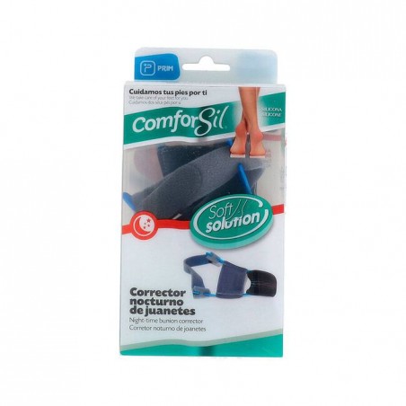 PRIM COMFORSIL Corrector Juanetes Nocturno Par es una férula ortopédica especialmente diseñada para aliviar el dolor causado por los juanetes y mantener el dedo gordo del pie en su posición natural durante la noche. Este corrector de juanetes está indicado para personas que sufren de deformidad en el hallux valgus y buscan mejorar su calidad de vida mediante una solución cómoda, eficaz y de uso nocturno.