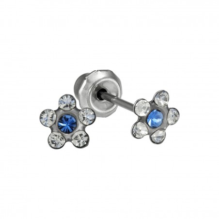 PRIM INVERNESS PENDIENTE ACERO INOXIDABLE 119C FLOR NATURAL AZUL es un pendiente diseñado para la perforación del lóbulo de la oreja, especialmente indicado para bebés y pieles sensibles. Fabricado en acero inoxidable de grado médico, asegura la máxima seguridad, resistencia y propiedades antialérgicas, gracias a la ausencia de níquel. Su elegante diseño en forma de flor con cristales azules aporta un toque estético delicado y natural, facilitando a la vez una adecuada cicatrización.