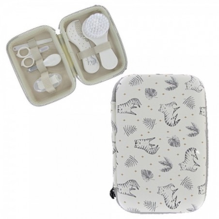- Incluye: tijeras con puntas redondeadas, cortauñas, lima de cristal, cepillo de fibras suaves, peine de puntas romas y dedil de silicona con cepillo bucal.