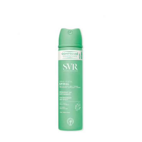 SVR Spirial Vegetal Spray 75 ml es un desodorante antitranspirante en formato aerosol especialmente formulado para regular la sudoración normal o excesiva en axilas, manos y pies. Este producto innovador está indicado para adolescentes y adultos, incluso con pieles sensibles o irritadas tras la depilación o el afeitado, asegurando protección eficaz frente a la humedad y el mal olor durante 48 horas gracias a su complejo vegetal y activos calmantes.