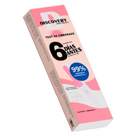 TEST DE EMBARAZO DISCOVERY 6 DÍAS ANTES 1 UNIDAD es un test rápido de diagnóstico que te permite detectar la hormona hCG en orina hasta 6 días antes de la fecha en que debería iniciarse tu periodo. Su avanzada sensibilidad lo convierte en una opción fiable para mujeres que quieren saber si están embarazadas lo antes posible y obtener resultados cómodamente desde casa.