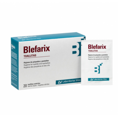 Toallitas Blefarix 20 uds es un producto específico para la higiene de párpados y pestañas, presentado en prácticos sobres unidosis y formulado para eliminar eficazmente impurezas, descamación y seborrea. Está indicado para bebés, niños y adultos que buscan una solución segura y estéril para el cuidado ocular diario, especialmente en condiciones como blefaritis, conjuntivitis u obstrucción del conducto lacrimal.