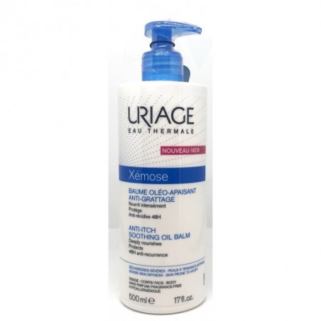 Uriage Xémose Bálsamo Oleo-Calmante 500 ml es un tratamiento dermatológico avanzado diseñado para aliviar y nutrir intensamente las pieles muy secas, con tendencia atópica o con brotes de eczema. Este bálsamo en aceite está indicado tanto para bebés, niños y adultos que buscan calmar el picor, restaurar la barrera cutánea y reducir la frecuencia de la sequedad severa.